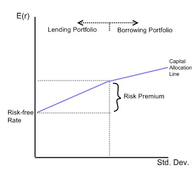 • CAL là đường thẳng trên biểu đồ rủi ro-lợi nhuận (trục hoành: độ lệch chuẩn, trục tung: lợi nhuận kỳ vọng) bắt đầu từ lợi nhuận phi rủi ro (risk-free rate) và đi qua điểm đại diện cho danh mục rủi ro được chọn.